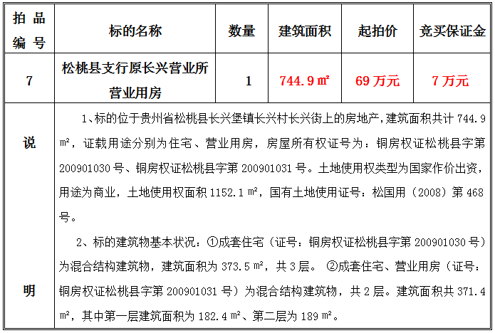 3、松桃縣支行原長興營業(yè)所營業(yè)用房,建筑面積共:744.9㎡;起拍價(jià):69萬元;競(jìng)買保證金:7萬元。