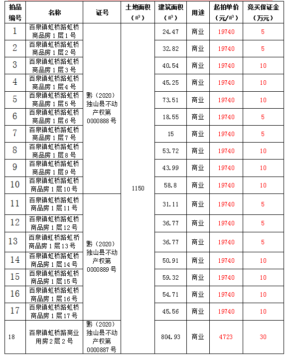 1.獨(dú)山縣百泉鎮(zhèn)虹橋路商業(yè)用房18間,建筑面積:15—804.93.㎡,起拍價(jià)4723—19740元/㎡;