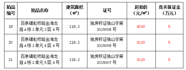 2.獨(dú)山縣百泉鎮(zhèn)虹橋路金海龍庭A棟2單元,住宅3套,建筑面積:每套119.2㎡,起拍價(jià):4030—4120元/㎡;