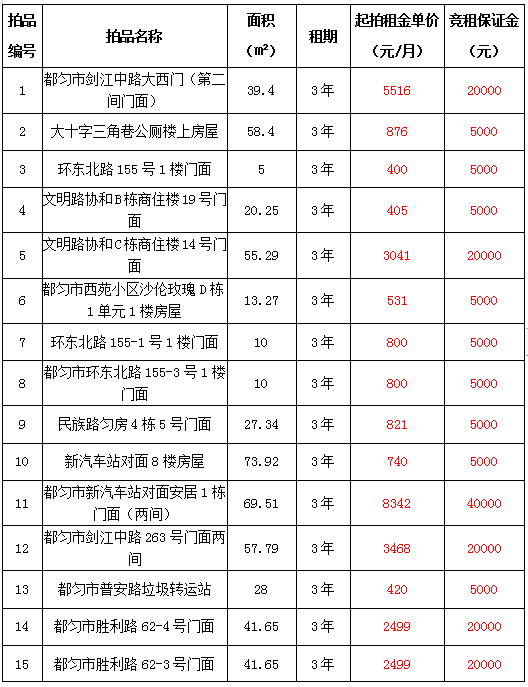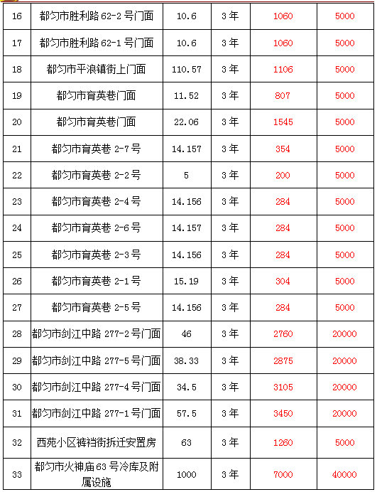 1、都勻市劍江中路、環(huán)東北路、文明路、民族路、勝利路、會云橋、育英巷等62處門面3年租賃權(quán),面積約5㎡-137.74㎡;
