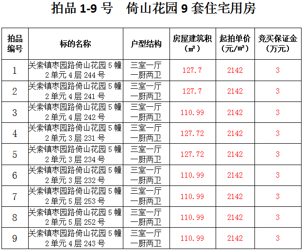 倚山花園9套住宅房產,建筑面積:110.99—127.72㎡,起拍價:2142元/㎡。