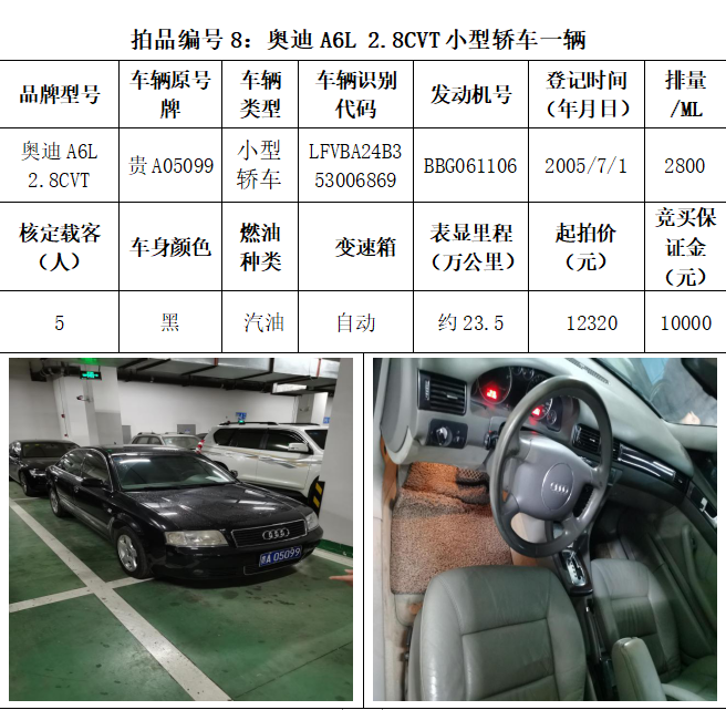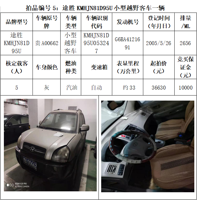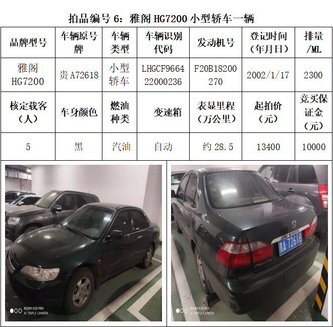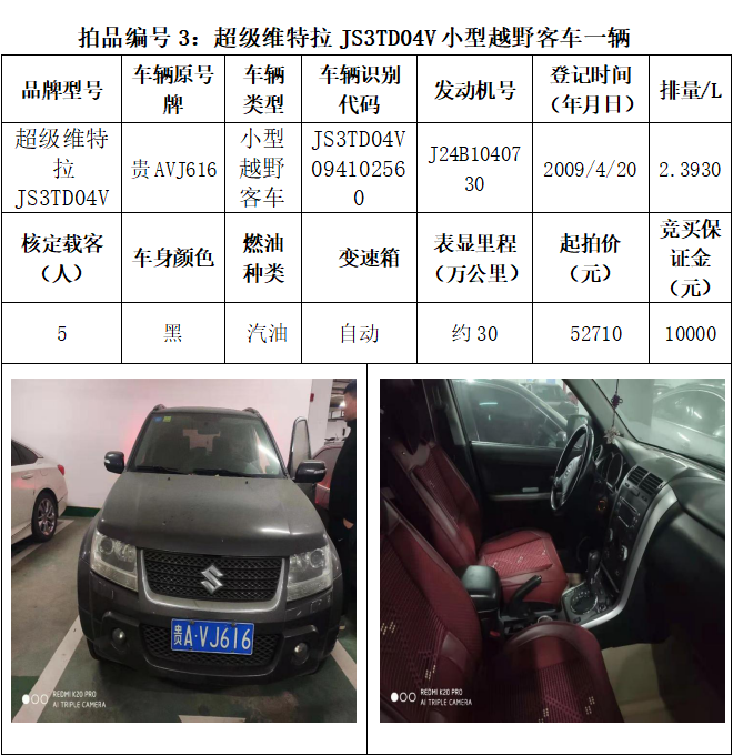 受委托,本公司定于2021年3月26日(星期五)下午14:30時(shí),在貴陽市中華南路20號新大陸數(shù)碼廣場10樓D座拍賣廳公開拍賣以下車輛:普拉多越野車1輛、超級維特拉越野車1輛、別克商務(wù)旅行車1輛、輝騰轎車1輛、途勝越野車1輛、雅閣轎車2輛、奧迪轎車1輛,長城牌小型越野客車1輛,共計(jì)9輛車。