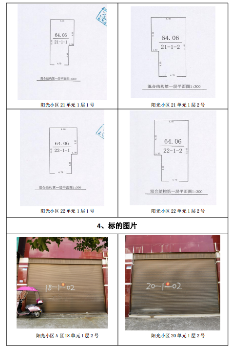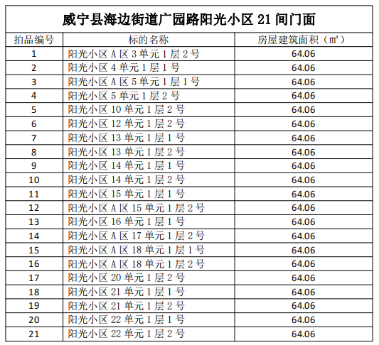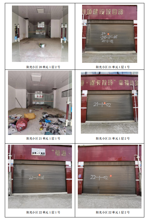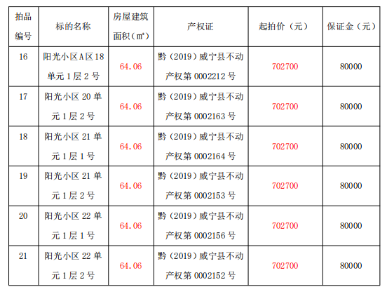 拍品編號16-21號標的位于威寧縣海邊街道廣園路陽光小區(qū),房屋結構均為:混合結構,權利性質:國有土地/出讓/其他,用途:商服用地/商業(yè)服務,使用期限:2012年12月20號至2052年12月19日。