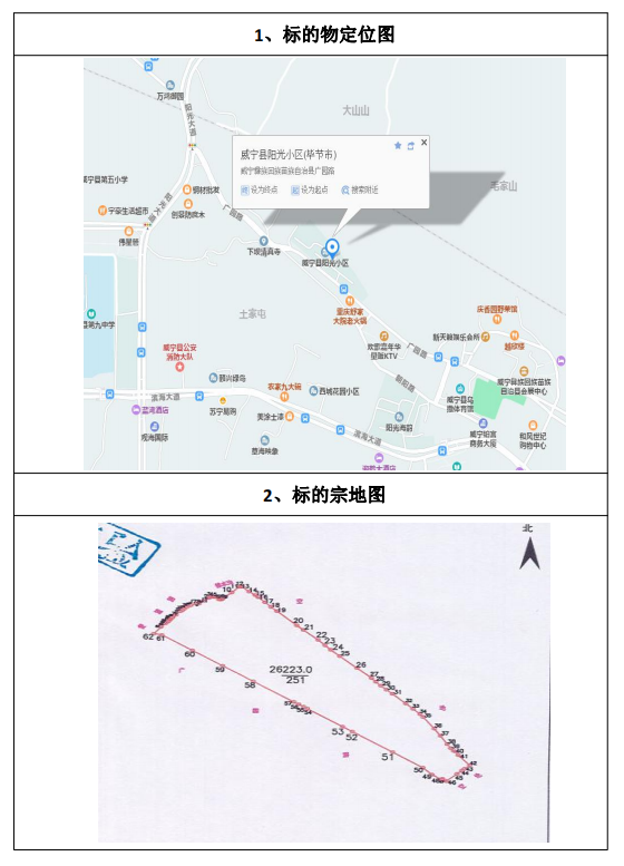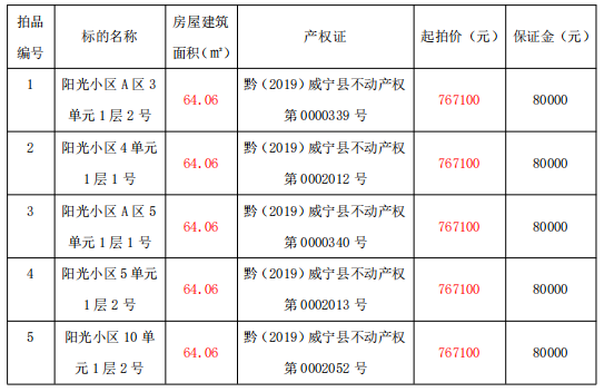 拍品編號1-5號標的位于威寧縣海邊街道廣園路陽光小區(qū),房屋結構均為:混合結構,權利性質:國有土地/出讓/其他,用途:商服用地/商業(yè)服務,使用期限:2012年12月20號至2052年12月19日。