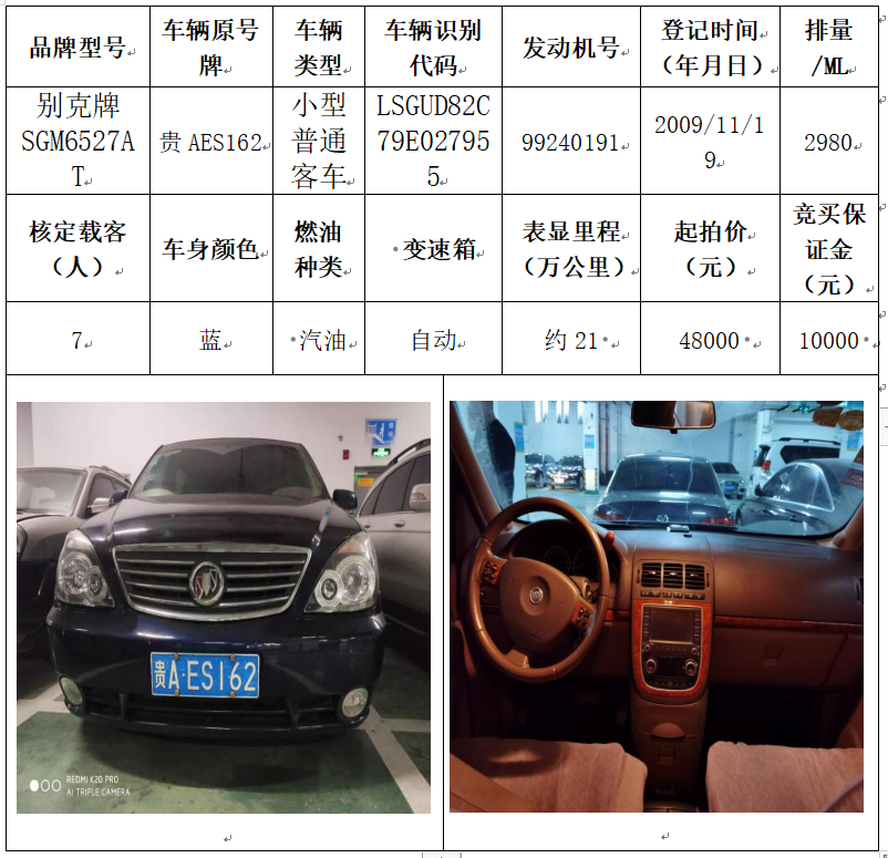 拍品編號4:別克牌SGM6527AT小型普通客車一輛