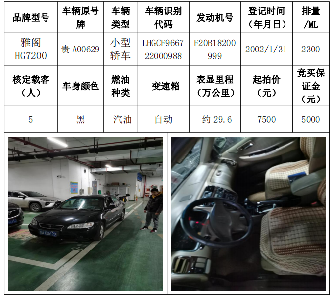拍品編號(hào)2:雅閣HG7200小型轎車(chē)一輛