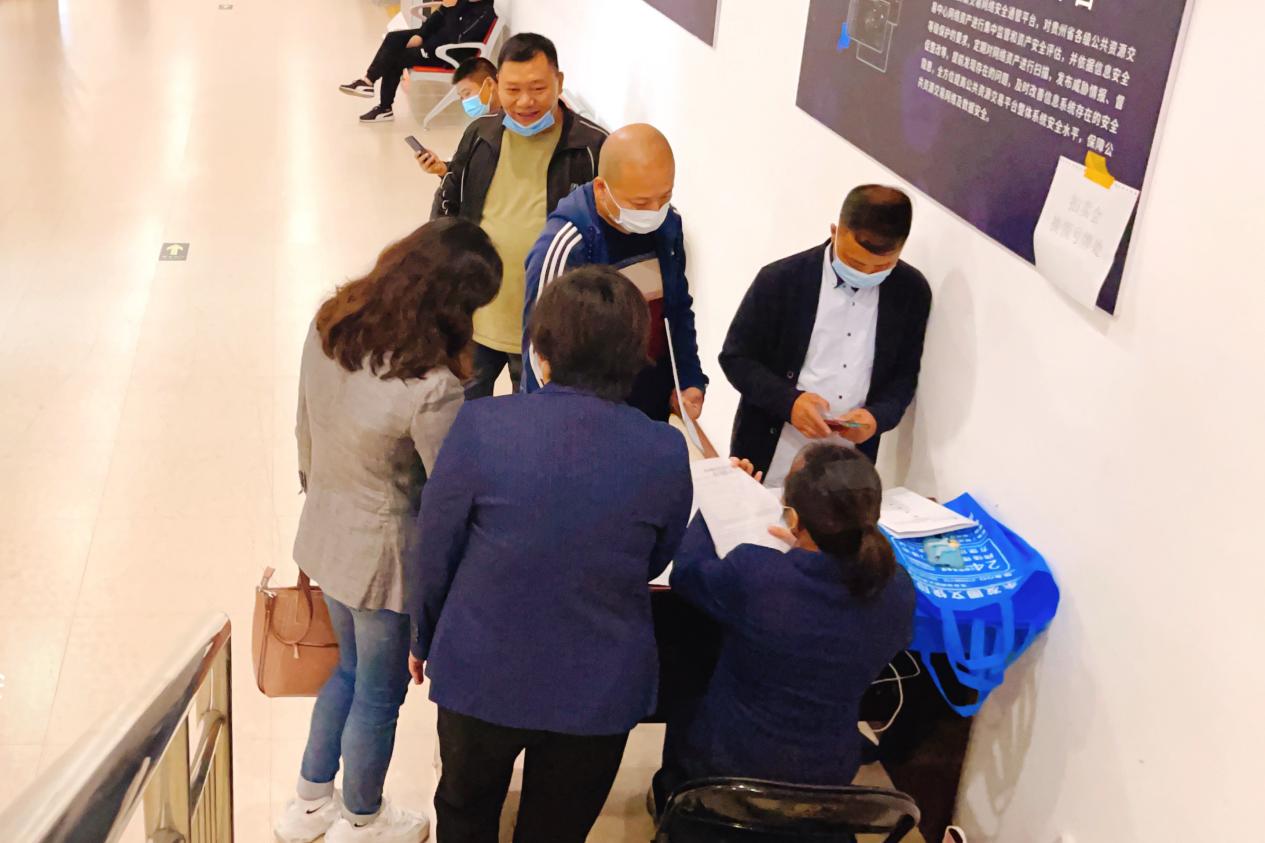 10月13日,翔泓拍賣公司工作人員提前入場進行會場布置,在座椅上張貼序號,入場人員按照防疫預案要求查驗“三碼”并依次登記、測量體溫,提醒競買人佩戴口罩、對號并隔位入座。