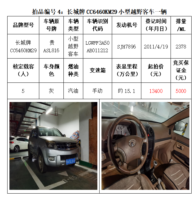 一、拍賣標的:雅閣HG7200小型轎車1輛、別克牌SGM6527AT小型普通客車1輛、途勝KMHJN81D95U小型越野客車1輛、長城牌CC6460KM29小型越野客車1輛、雪佛蘭SGM6470TAXD小型普通客車1輛、尼桑牌ZN6453WAG3小型普通客車1輛,索蘭托KNAKU811小型普通客車1輛,共計7輛車。