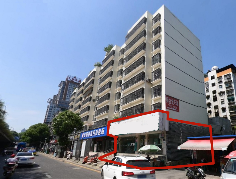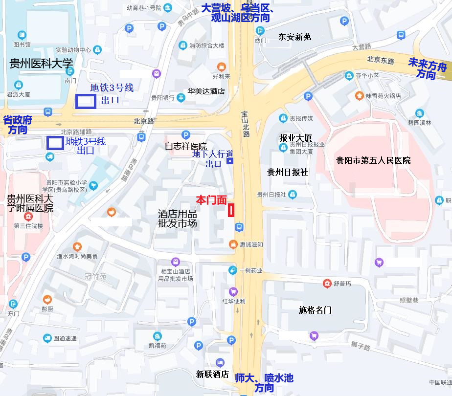 門面臨寶山北路,臨街面寬13.2米,目前空置,位于相寶山酒店用品批發(fā)市場大門右側(cè),與貴州日報社隔街相望。