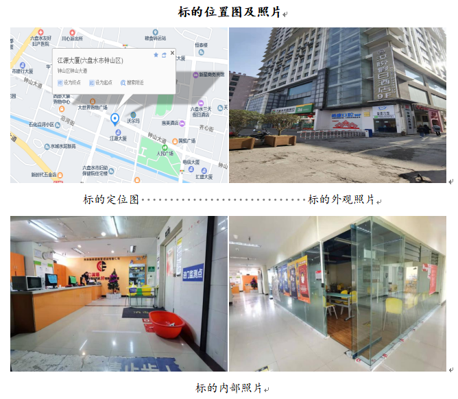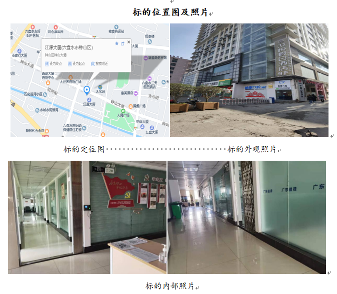 標(biāo)的位于六盤(pán)水市鐘山區(qū)鐘山中路江源大廈46號(hào)6層601室的商業(yè)房地產(chǎn),建筑面積為1181.04㎡,樓幢總層數(shù)為27層,所在樓憧為鋼筋混凝土結(jié)構(gòu),建成于2010年。