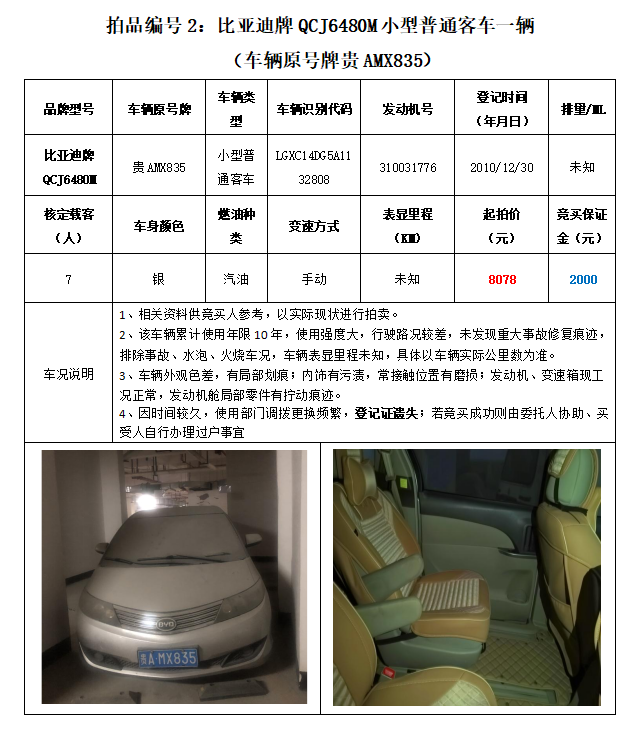 拍品編號2:原車牌號貴AMX835比亞迪牌QCJ6480M小型普通客車一輛;