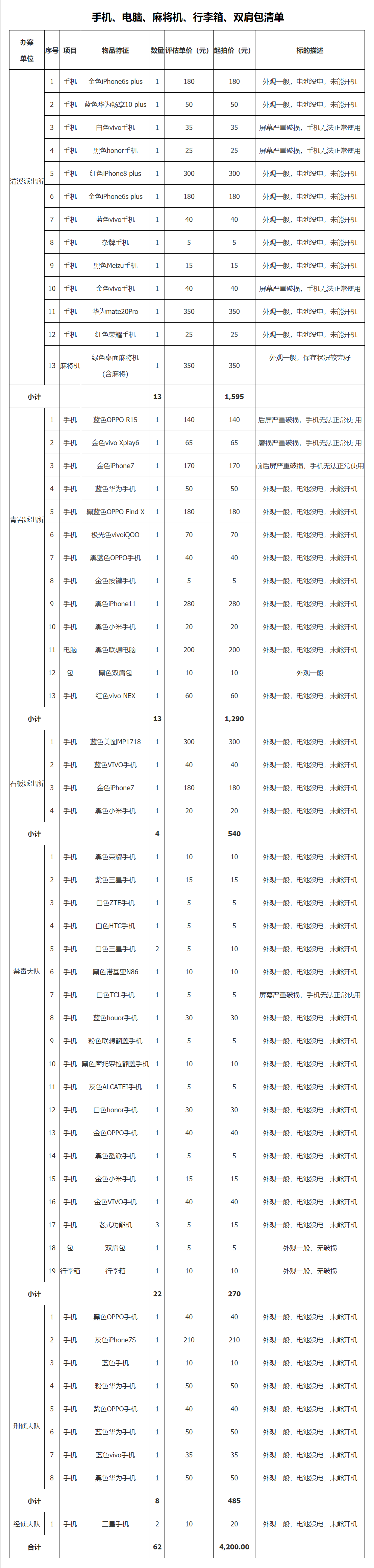 拍品編號7:手機、電腦、麻將機、行李箱、雙肩包一批(整體拍賣)。