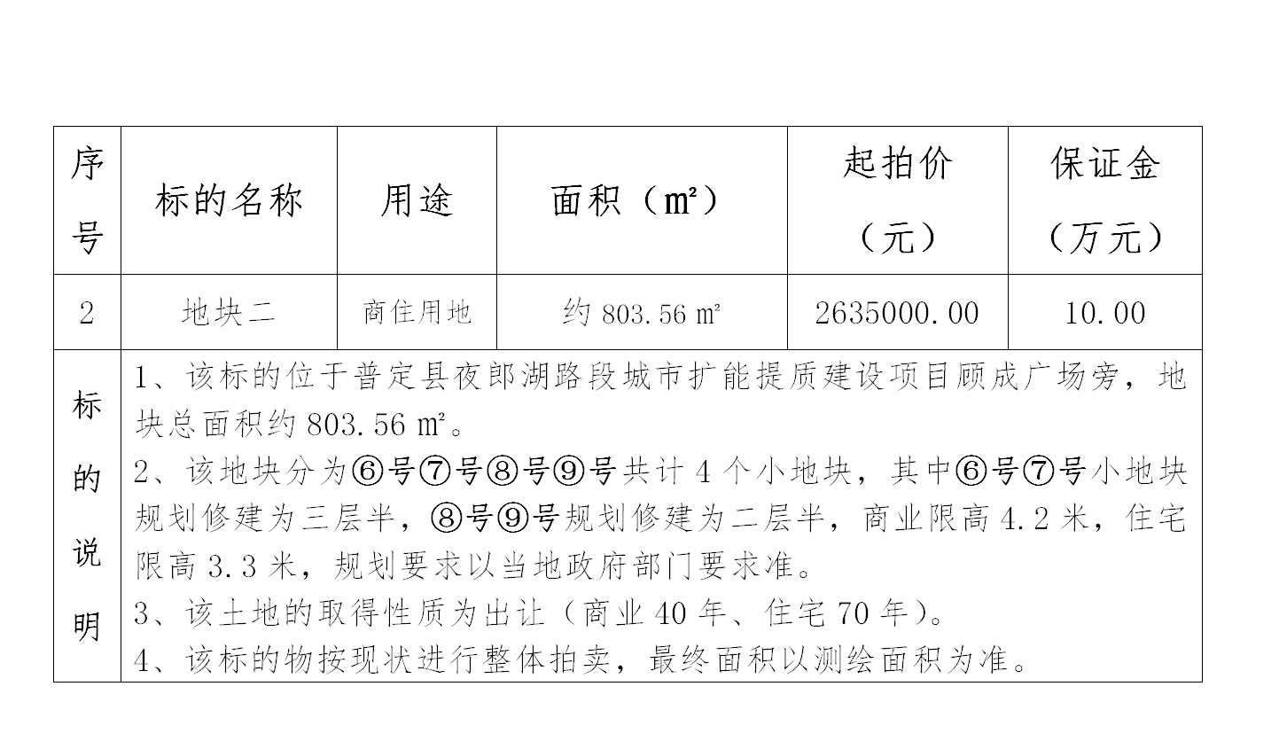 1、普定縣夜郎湖路段城市擴(kuò)能提質(zhì)建設(shè)項目沿線2宗國有土地使用權(quán),地塊一面積約1056.66㎡,地塊二面積約803.56㎡(其中地塊一分為5個小地塊、地塊二分為4個小地塊,土地用途為商住用地)。